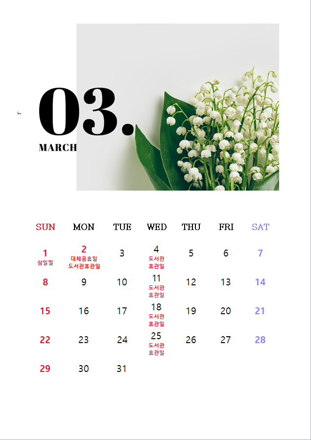 2026년 03월 02일(월) 대체공휴일 휴관일을 안내 드리니 도서관 이용에 참고 바랍니다.